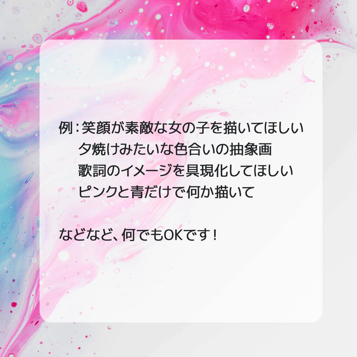 いただいた『お題』を元に、自由にイメージして絵を描きます!どんな絵が届くかはお楽しみに!